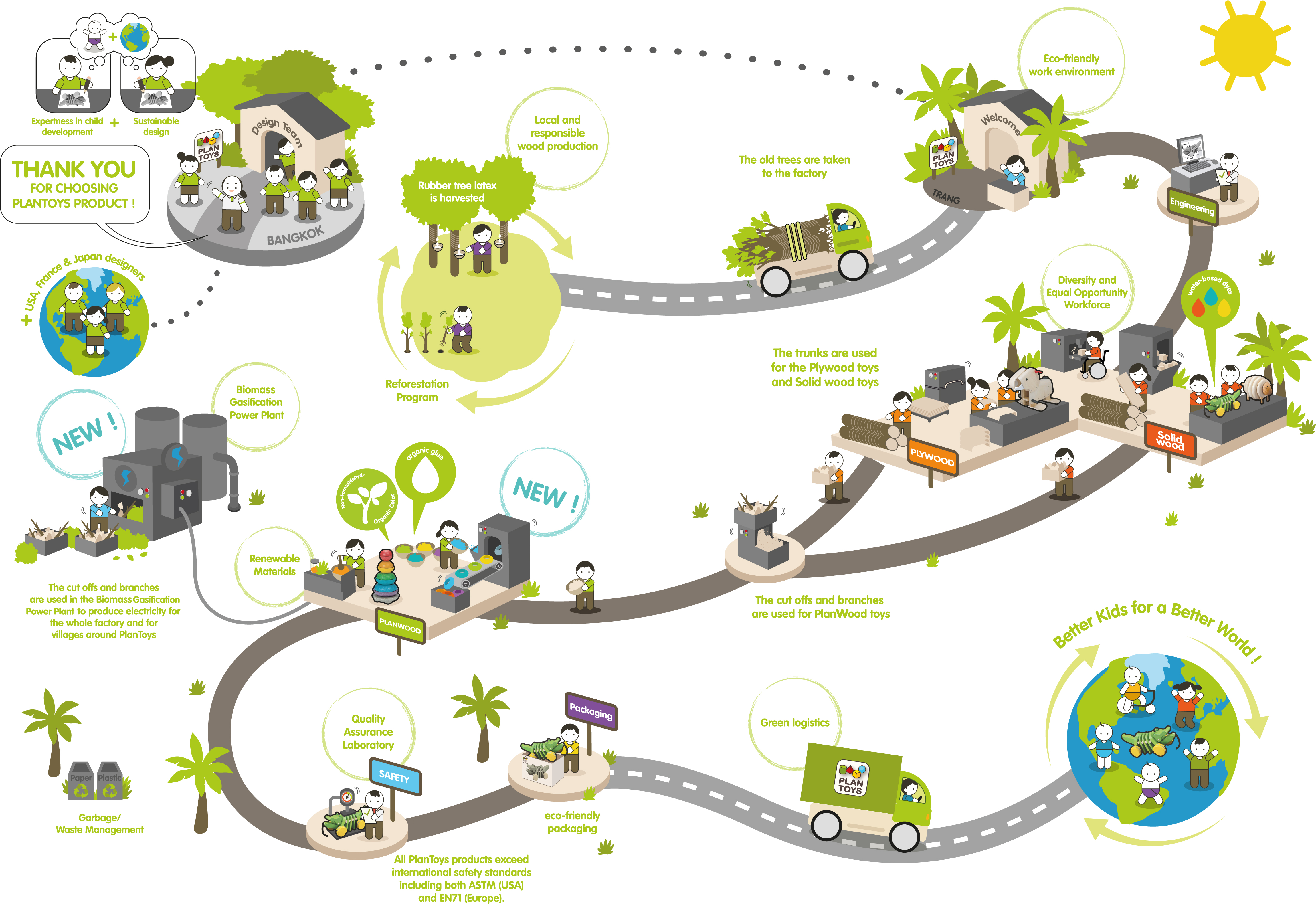 A marca PlanToys concentra-se principalmente na produção de brinquedos de madeiras seguras, feitos a partir de madeiras de borracha recuperadas. Estes brinquedos ajudam no desenvolvimento das crianças, especialmente durante os primeiros cinco anos de formação em que os pais devem incentivar as crianças a experimentar a liberdade de brincar e a proximidade com a natureza.